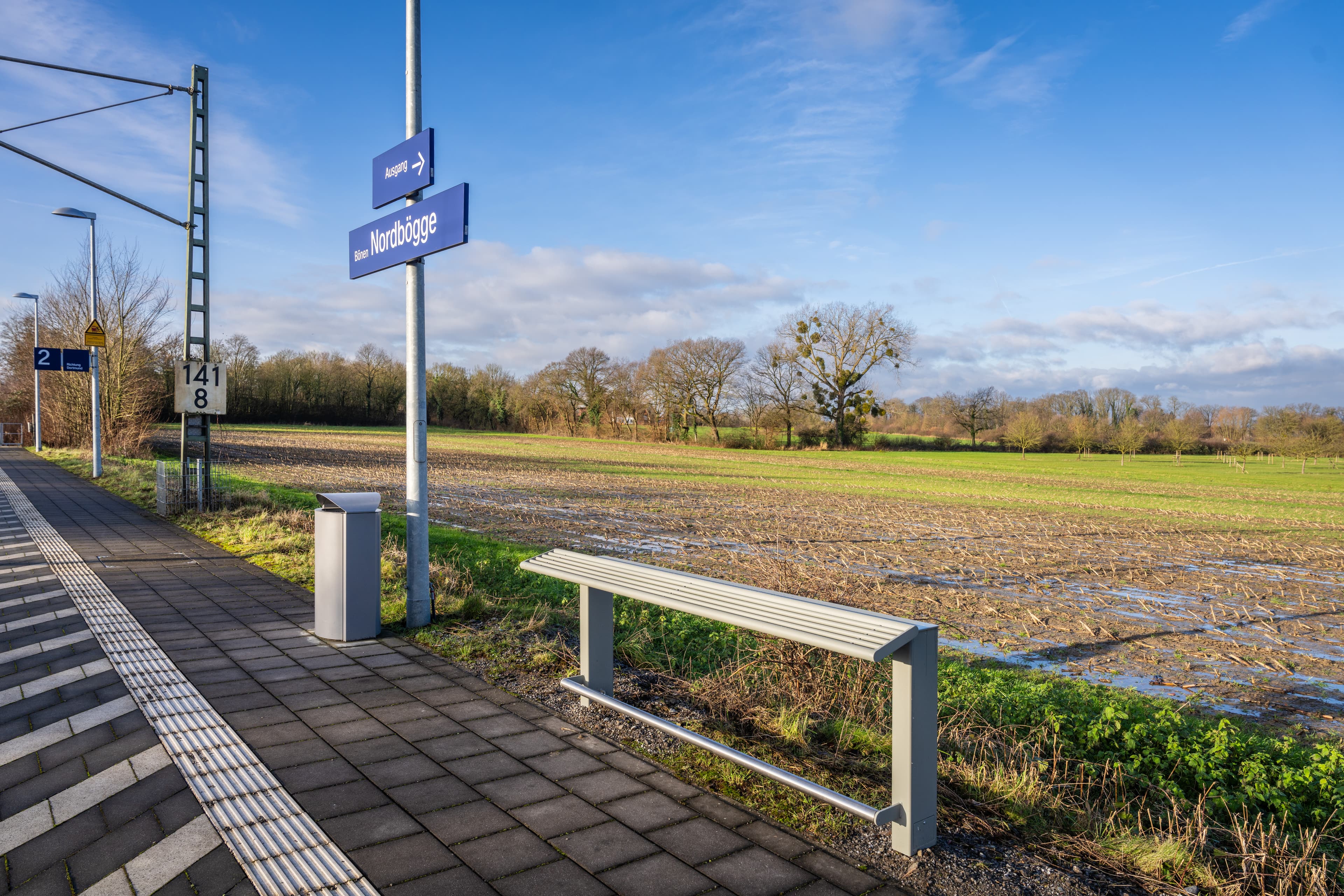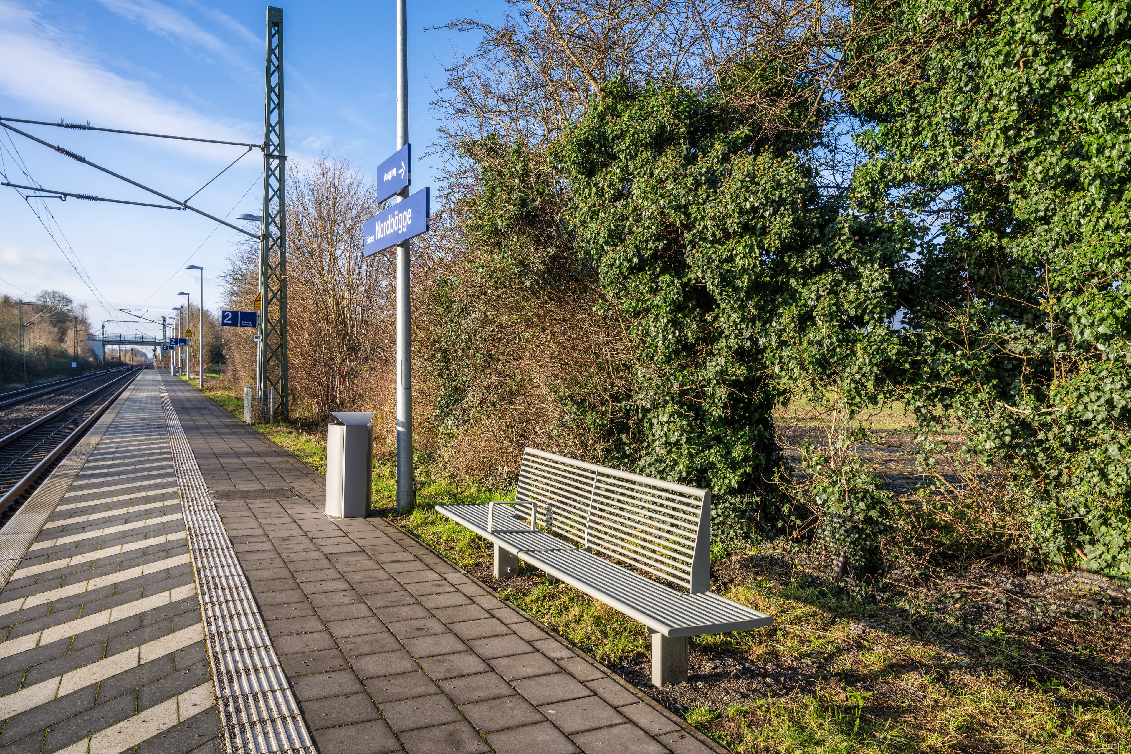 Durch die Gestaltung der DB Pluspunkte in einer hellen Farbkombination aus Orange- und Brauntönen werden die Reisenden am Bahnhof Bönen-Nordbögge herzlich willkommen geheißen. An den Bahnsteigen können Reisende dank der Schaffung neuer moderner Sitz- und Anlehngelegenheiten entspannt ihre Reise antreten.