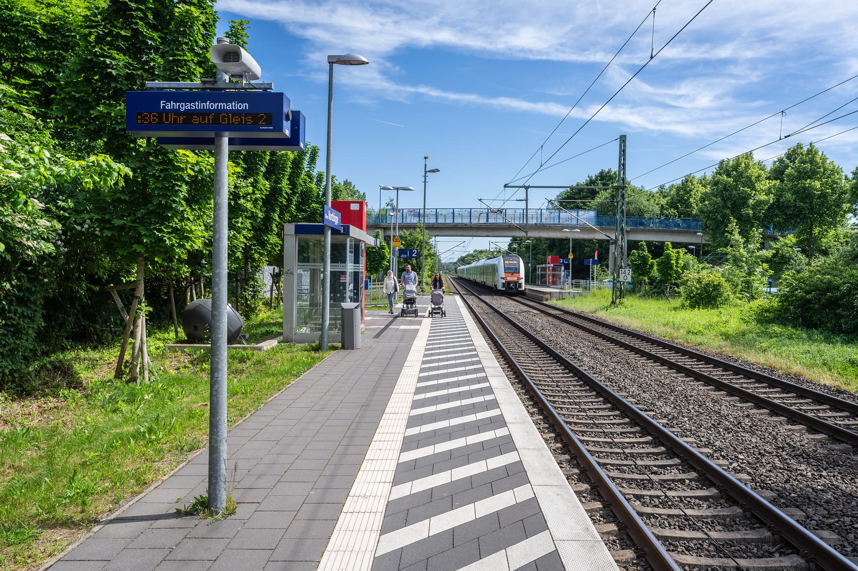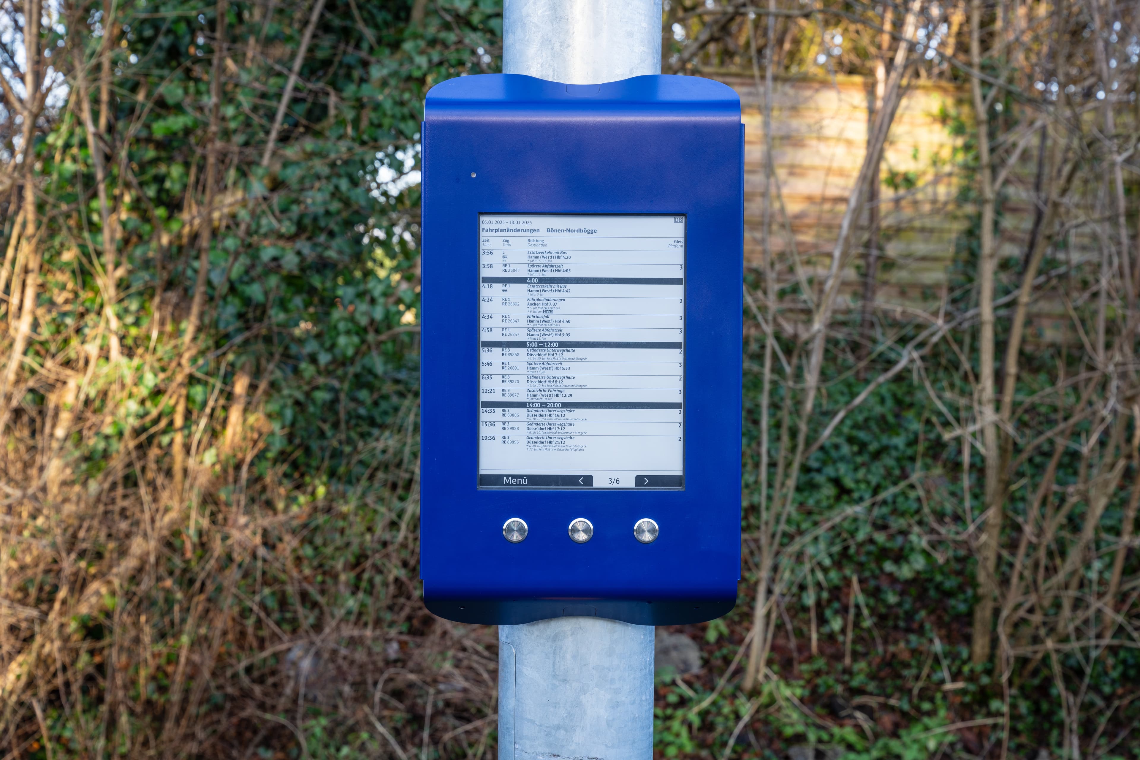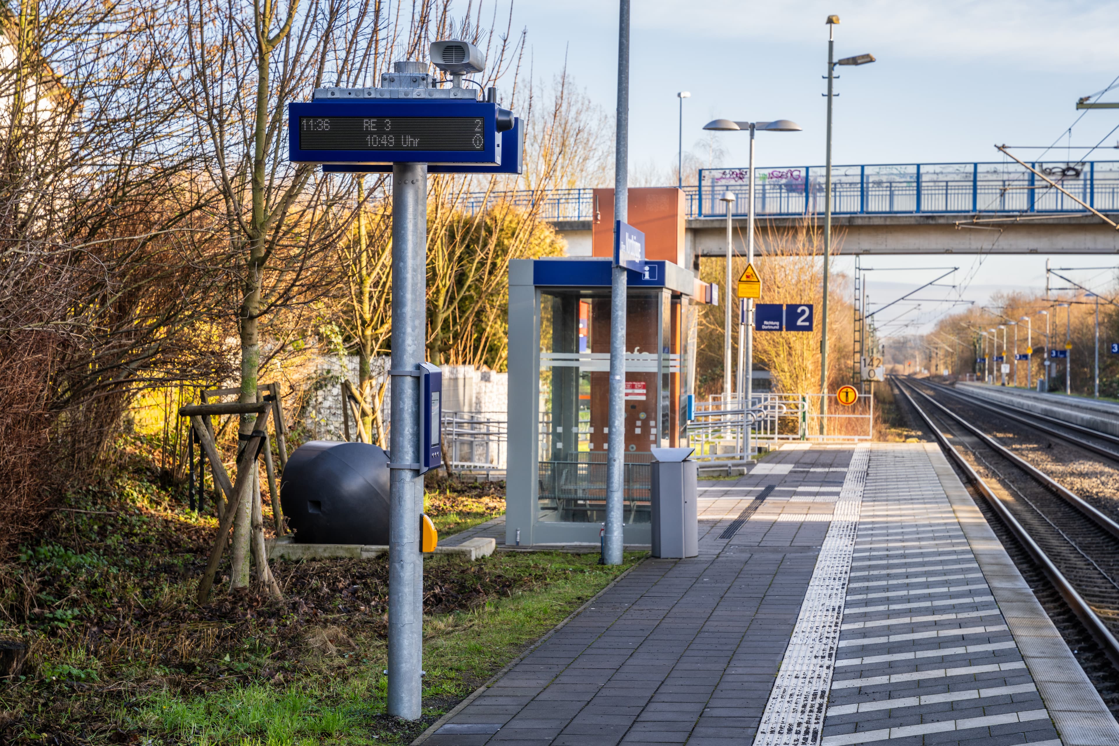 Link zu diesem Abschnitt kopierenAuf den Bahnsteigen wurden neue dynamische Schriftanzeiger (DSA+) und digitale Aushänge zur Baukommunikation montiert. Durch einen Taster unterhalb des digitalen Aushangs können Reisende sich zukünftig sowohl die Inhalte der DSA+ als auch des digitalen Aushanges vorlesen lassen.