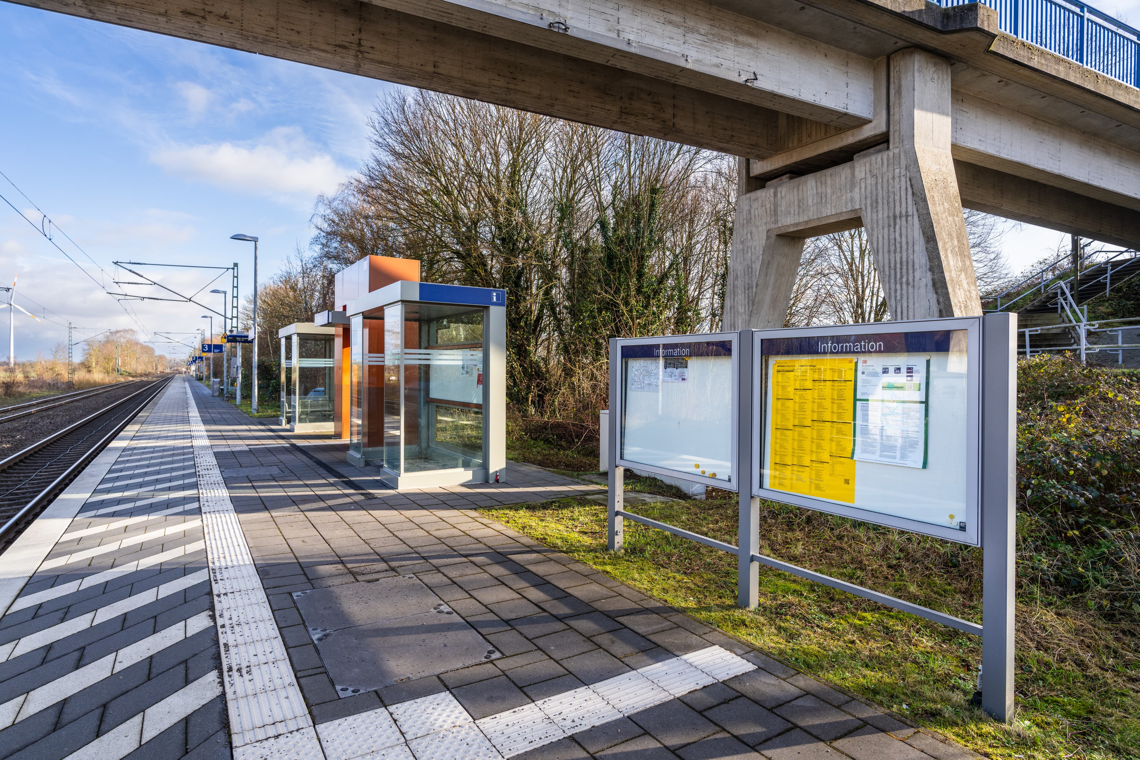 Link zu diesem Abschnitt kopierenMit den neu gestalteten DB Pluspunkten auf den Bahnsteigen in einer freundlich wirkenden Farbkombination aus Orange- und Brauntönen und der Montage neuer Sitz- und Anlehngelegenheiten wird die Aufenthaltsqualität am Bahnhof gesteigert.