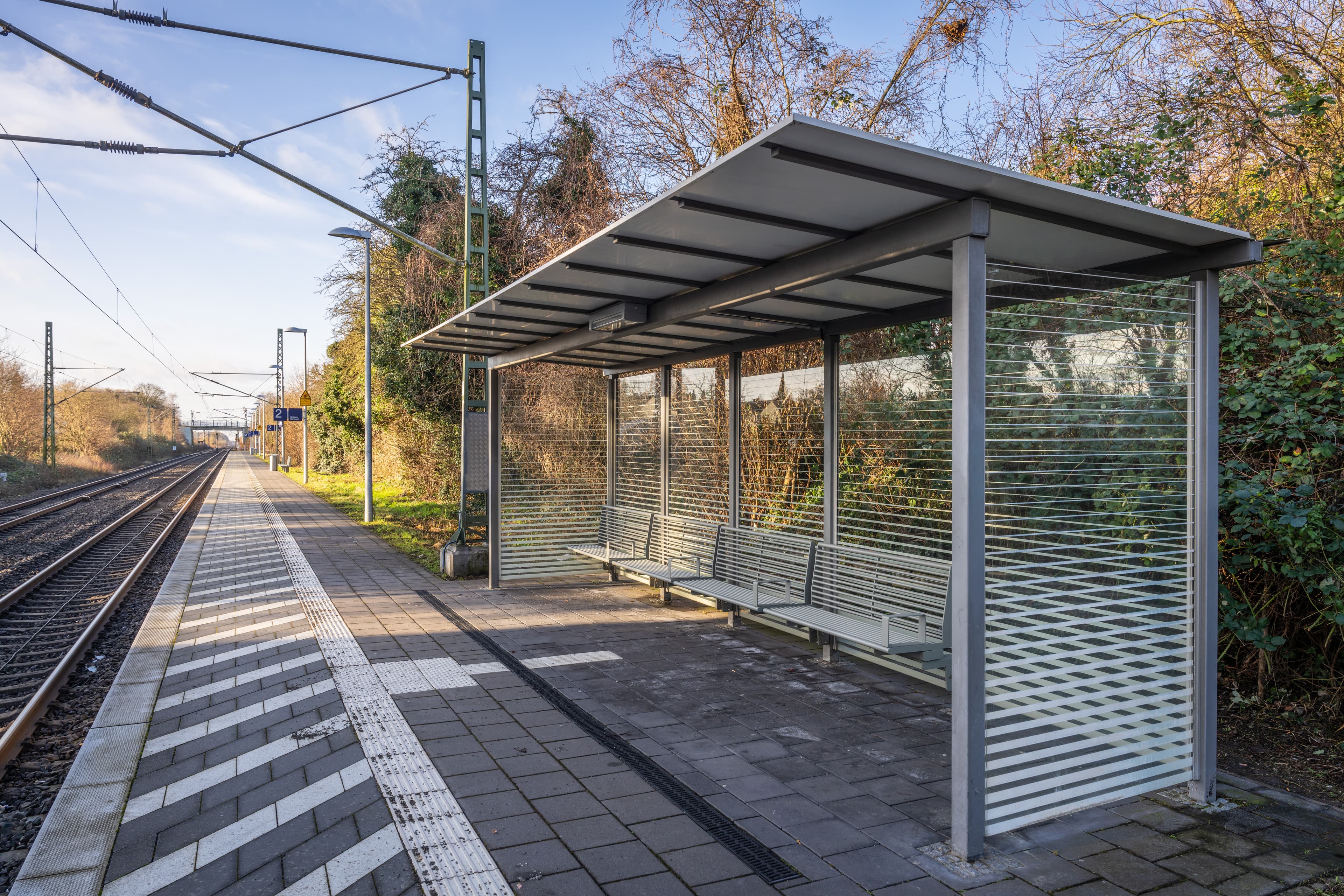 Link zu diesem Abschnitt kopierenAm Bahnsteig laden neu designte Sitz- und Anlehnmöbel aus pulververzinktem Stahl zum Verweilen ein. Zudem wurde eine Vitrine am Bahnsteig versetzt und die Bestandsvitrinen wurden in einem Braunton entsprechend der DB-Pluspunkte gestrichen.