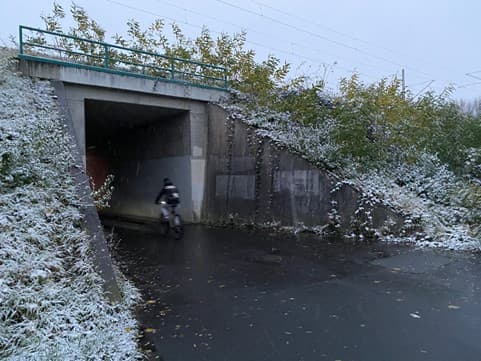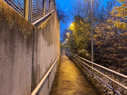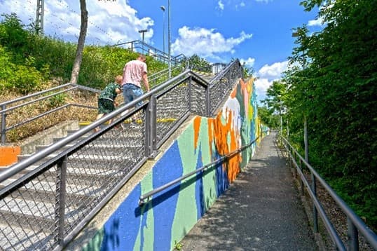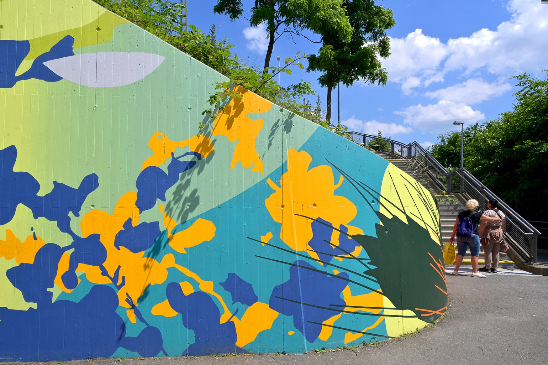 Link zu diesem Abschnitt kopierenInsbesondere die Unterführung und die Betonflächen der Rampen wurden in Zusammenarbeit mit den Künstler:innen der Freiraumgalerie aufgewertet. Durch eine Gestaltung mit grafischen Blätterformen und grünen Grundtönen wird Bezug auf die ländliche Umgebung genommen. Bei genauem Hinschauen können Reisende auch einzelne Stadtmotive und Häuserformen erkennen. Der Tunnel wurde in einem hellen Grünton gestrichen, um auch von innen zu strahlen. Zusätzlich wurde die Beleuchtung erneuert.