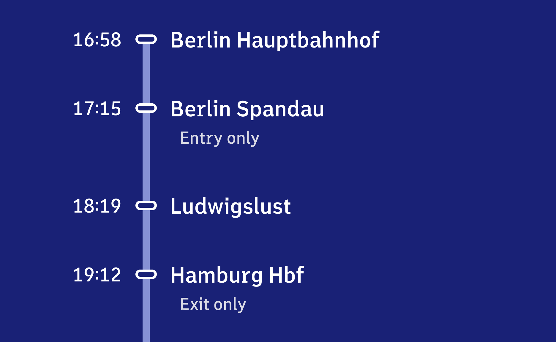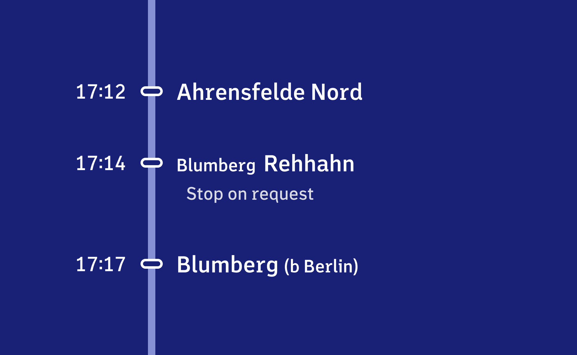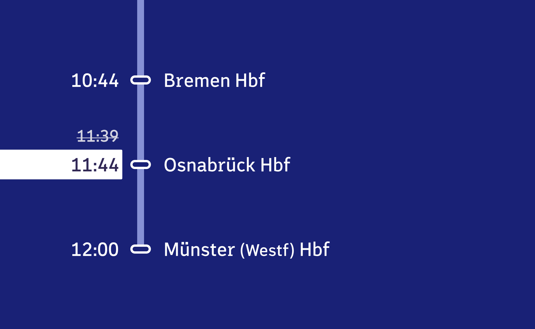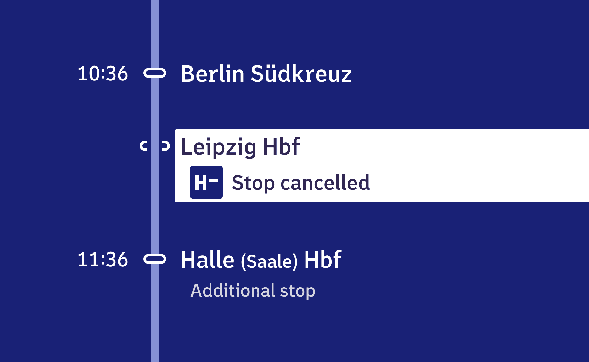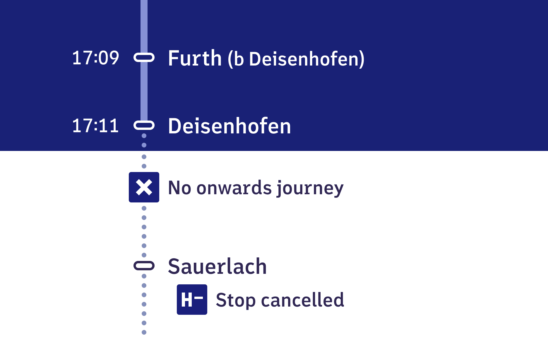 Copy link to this sectionThe design of deviations is strongly oriented towards the logics known from train destination displays: deviations are inverted – thus white instead of blue background.