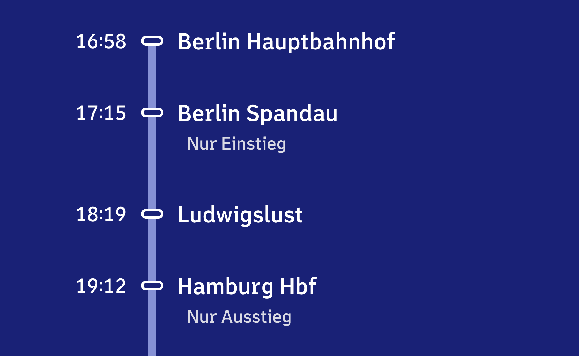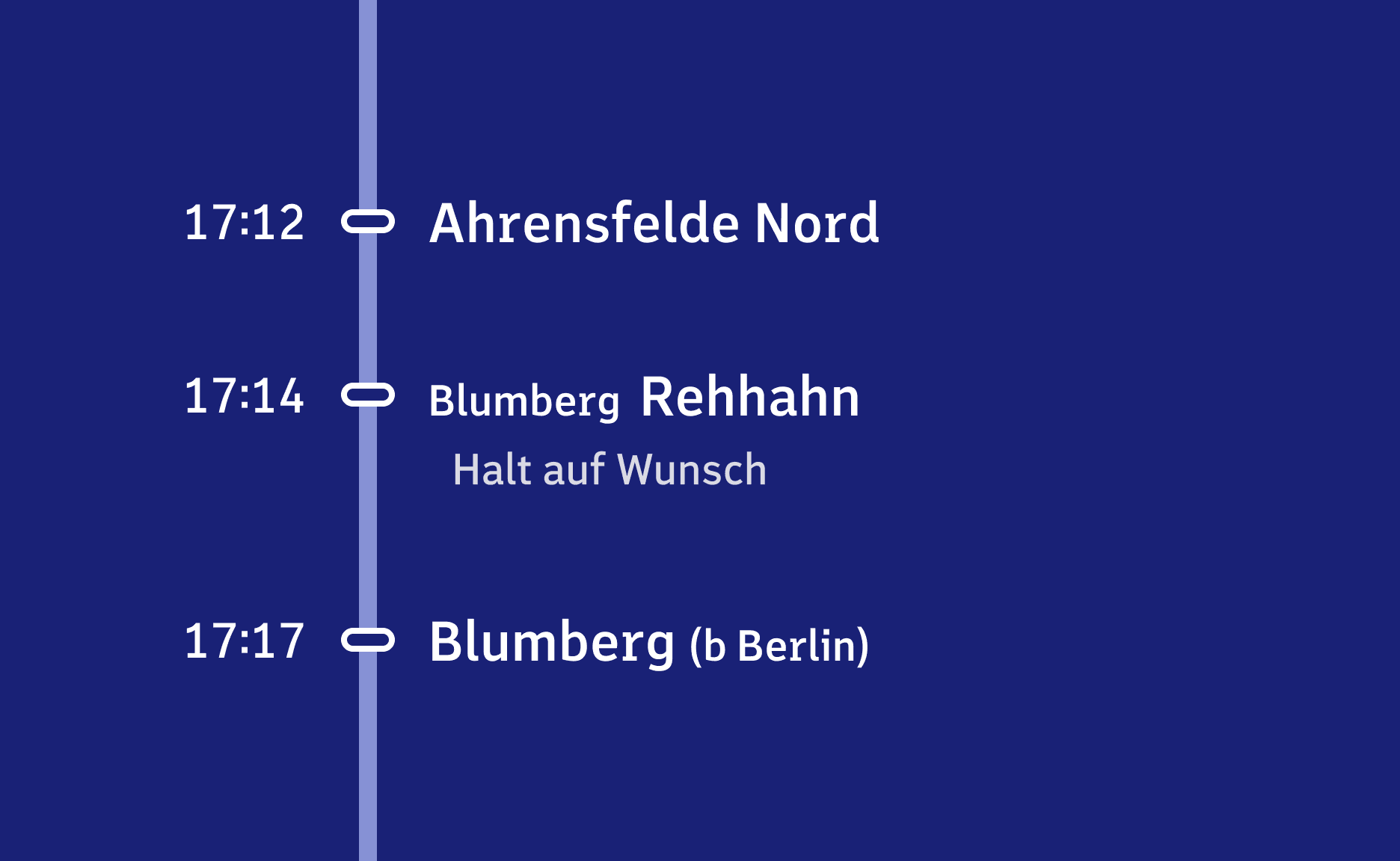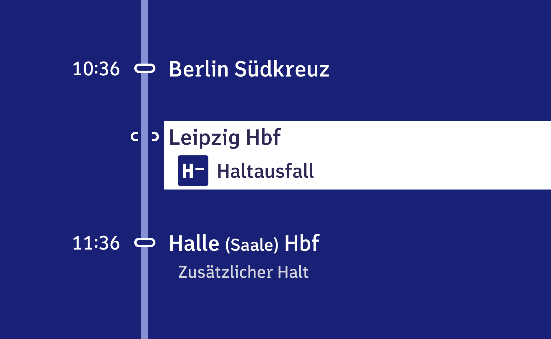 Link zu diesem Abschnitt kopierenDie Gestaltung der Abweichungen orientiert sich stark an den von den Zugzielanzeigern bekannten Logiken: Abweichungen werden invertiert dargestellt – also weißer statt blauer Hintergrund.