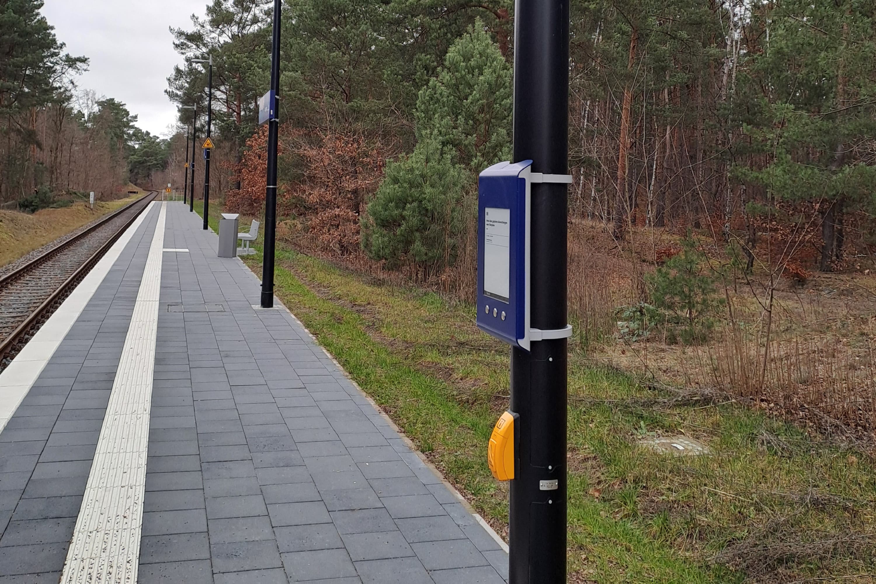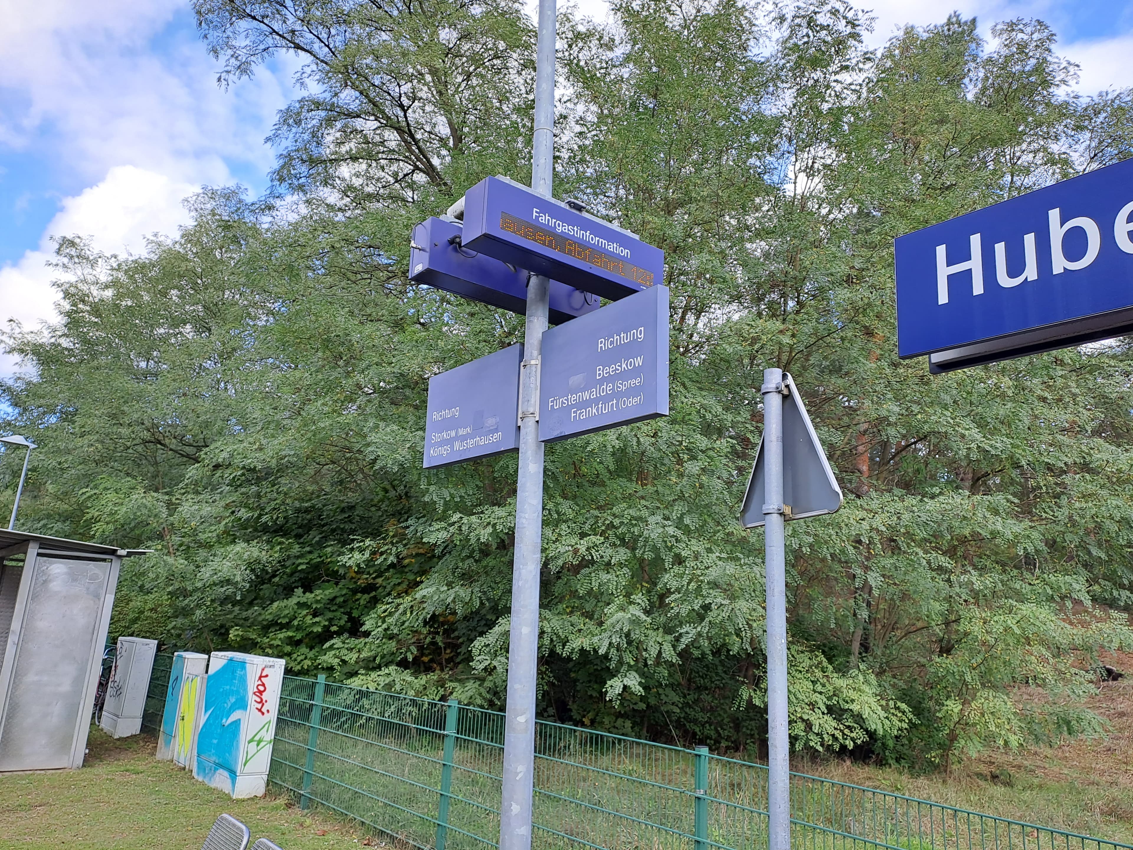 Link zu diesem Abschnitt kopierenDurch moderne Zugzielanzeiger und einen digitalen Aushang mit Bauinformationen können die Reisenden in Hubertushöhe schnell alle wichtigen Informationen zu Zugverbindungen und Fahrplanänderungen einsehen. Eine verbesserte Wegeleitung mit klarer Beschilderung rund um den Bahnsteig runden das Gesamterscheinungsbild ab.