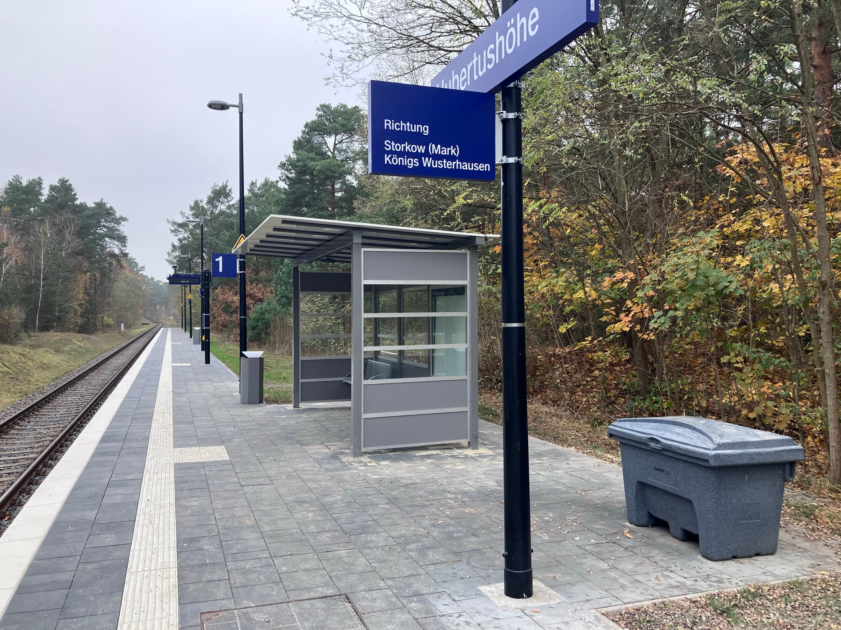Der erneuerte und aufgehöhte Bahnsteig am Bahnhof Hubertushöhe lädt die Reisenden mit seiner modernen Ausstattung und einer überarbeiteten Beschilderung zum klimafreundlichen Reisen ein.