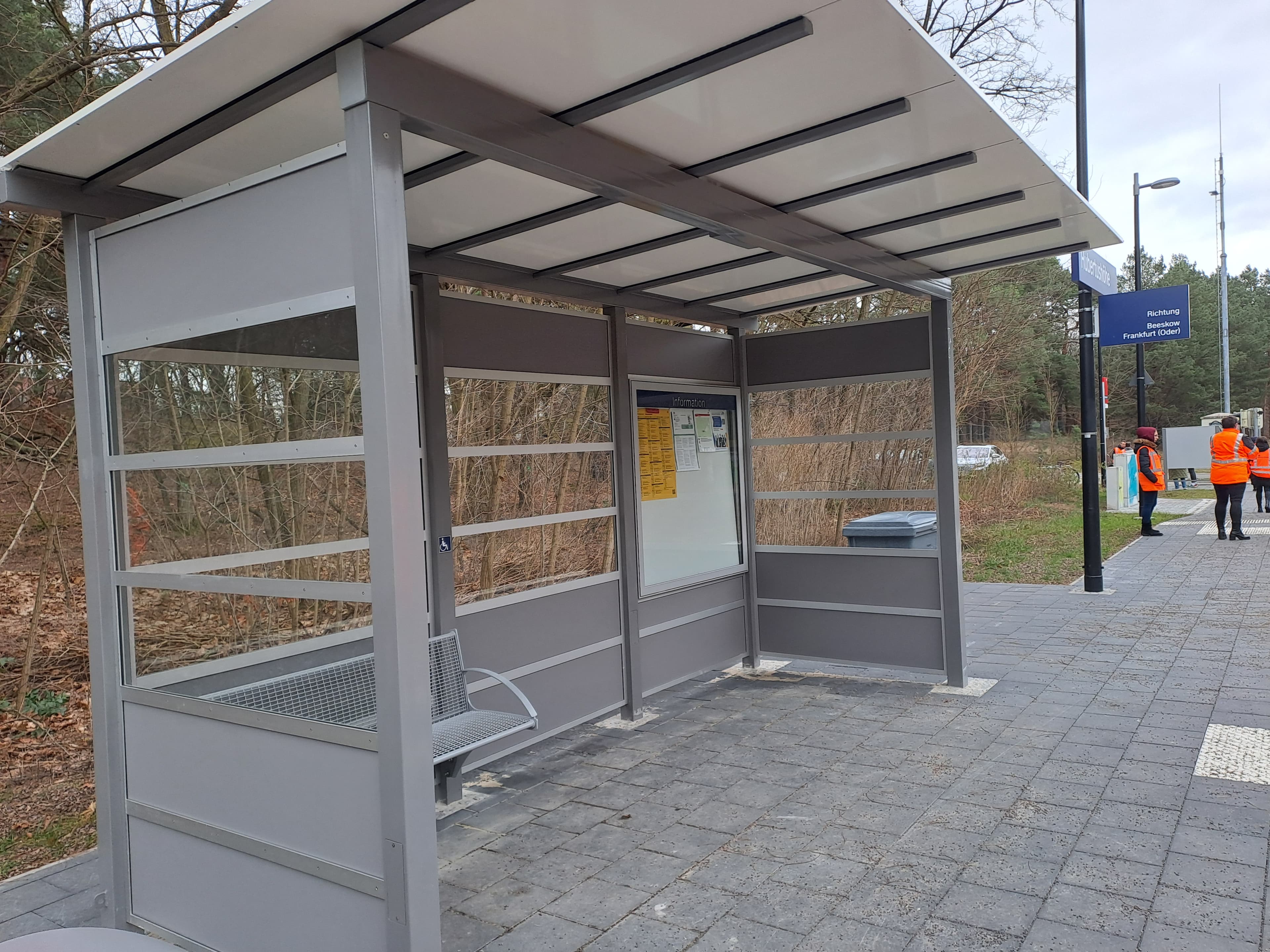 Link zu diesem Abschnitt kopierenDas vergrößerte Wetterschutzhaus mit Glaseinsätzen bietet nicht nur Schutz vor Regen und Wind, sondern schafft auch eine helle, offene Atmosphäre mit besserer Sicht auf einfahrende Züge und das Bahnsteiggeschehen. Zudem vermittelt das moderne Design einen einladenden und gepflegten Eindruck.