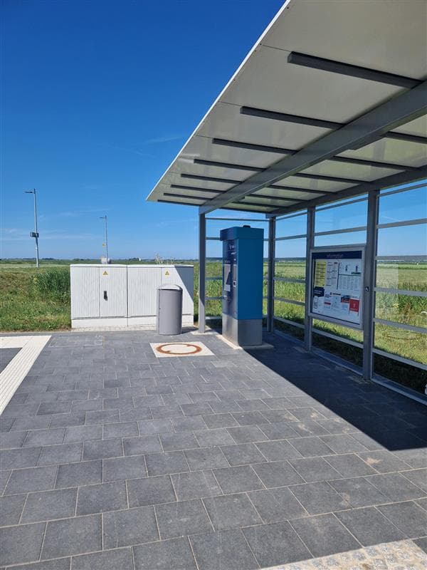 Beschauliches Dorf mit einem der ältesten Gotteshäuser Eiderstedts – Eine weitere Sitzbank auf dem Bahnsteig lädt zum Verweilen ein. Neu aufgestellte Wegweiser unterstützen bei der Orientierung des Umfelds.