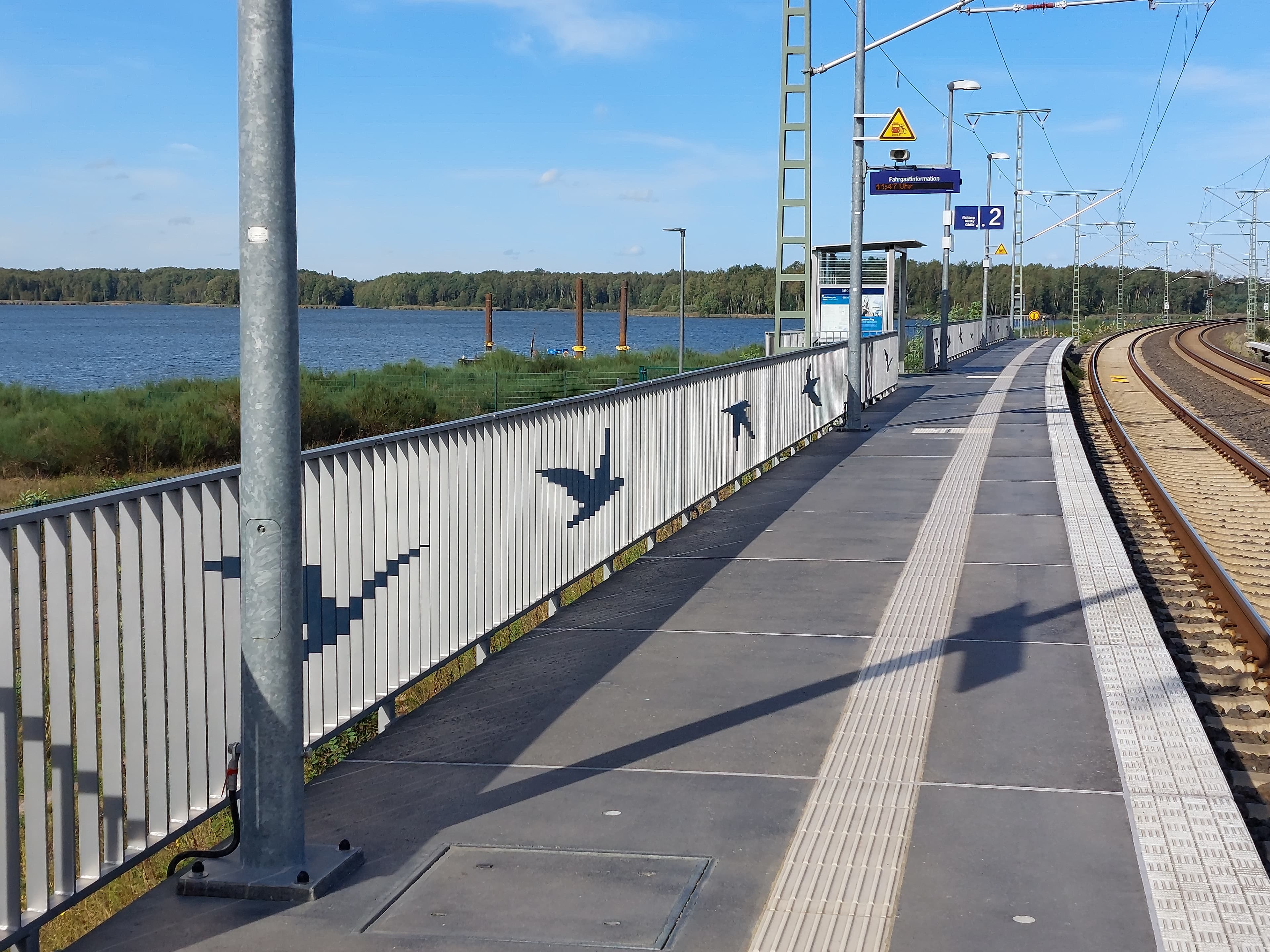 Bahnsteig 2 mit einem See im Hintergrund und neu bemaltem Geländer.