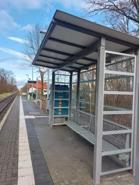 Link zu diesem Abschnitt kopierenDer Bahnsteig wurde mit zwei neuen Sitzbänken für das Wetterschutzhäuschen und einem separaten Anlehner ausgestattet.
