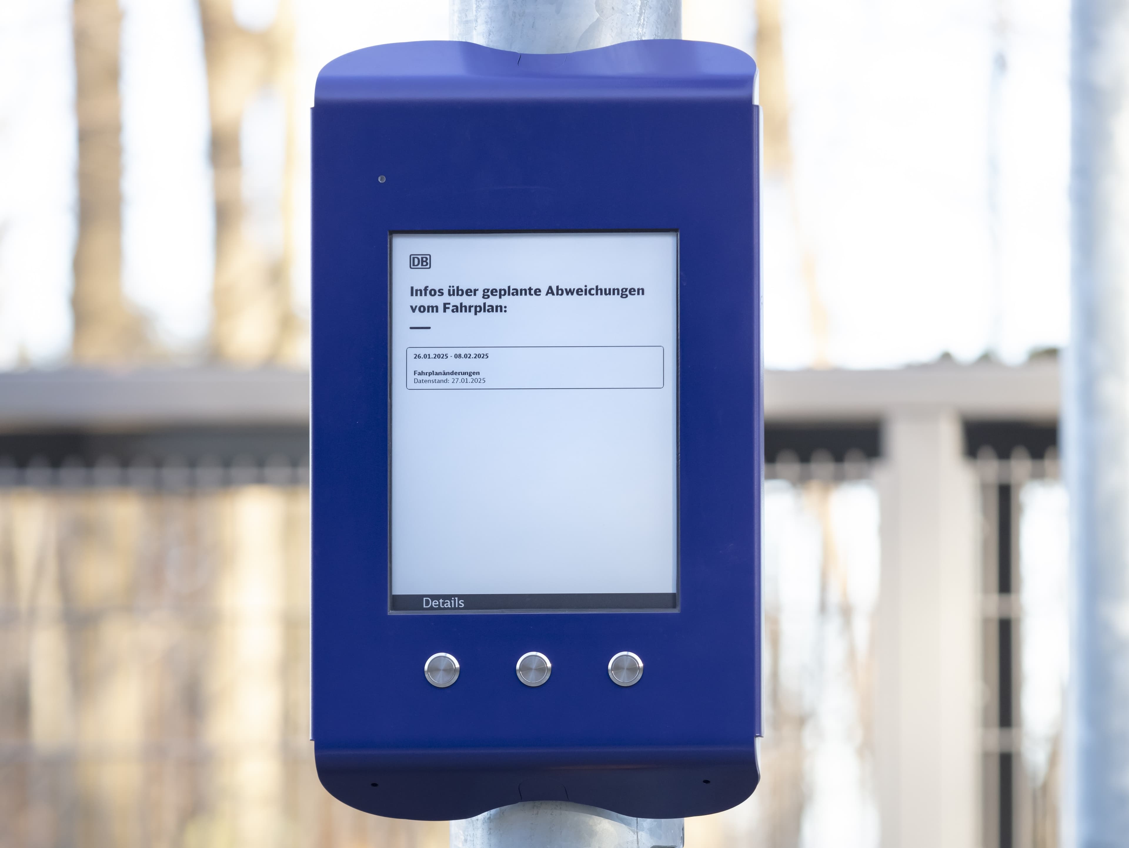 Link zu diesem Abschnitt kopierenFür eine verbesserte akustische und visuelle Reisendeninformation sorgt der dynamische Schriftenanzeiger DSA+. Er verfügt über ein mehrzeiliges Display, und wurde zusätzlich mit einem „Digitalen Aushang Baukommunikation“ (DAB) sowie einem Ansagetaster ausgestattet.