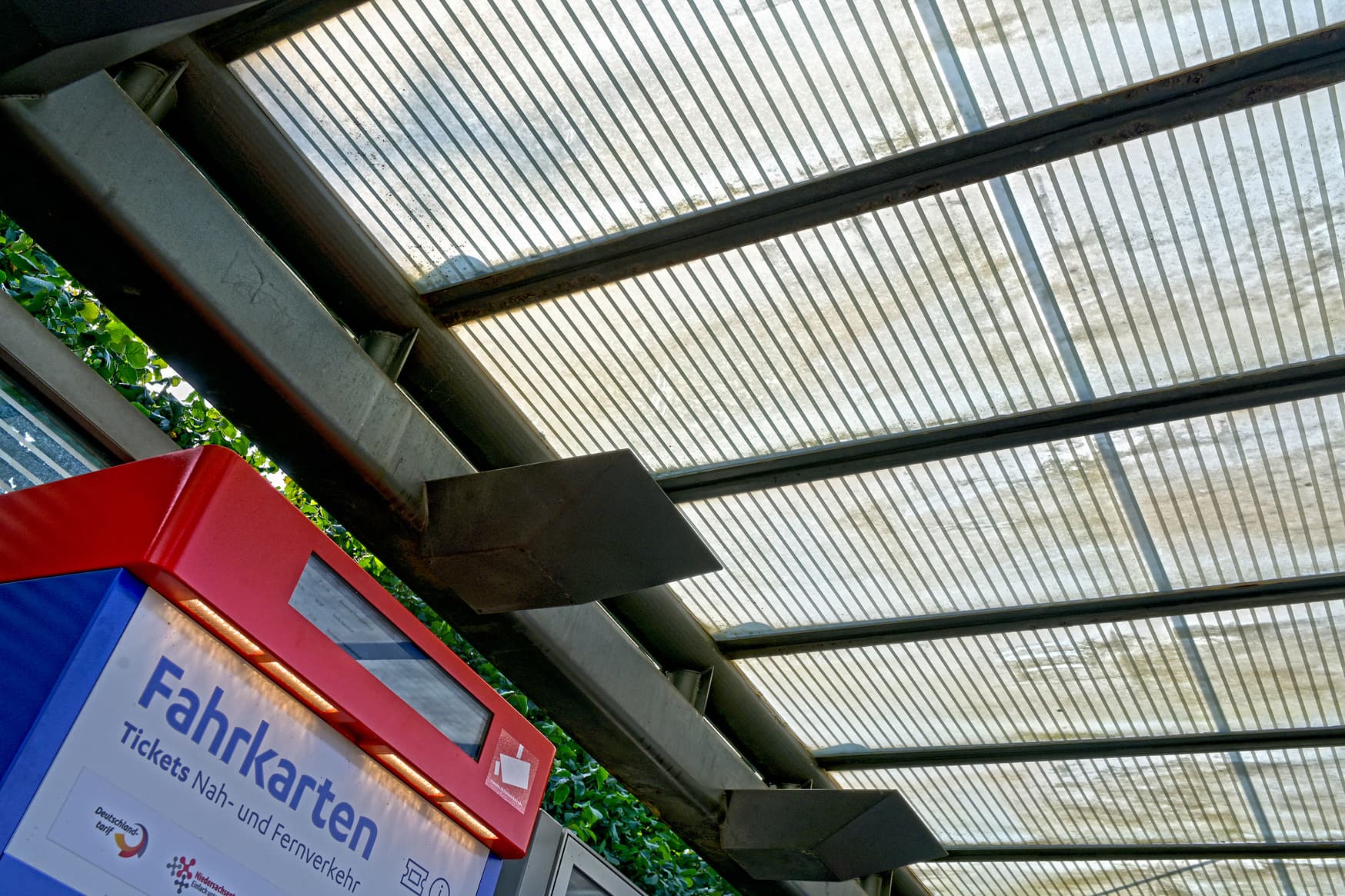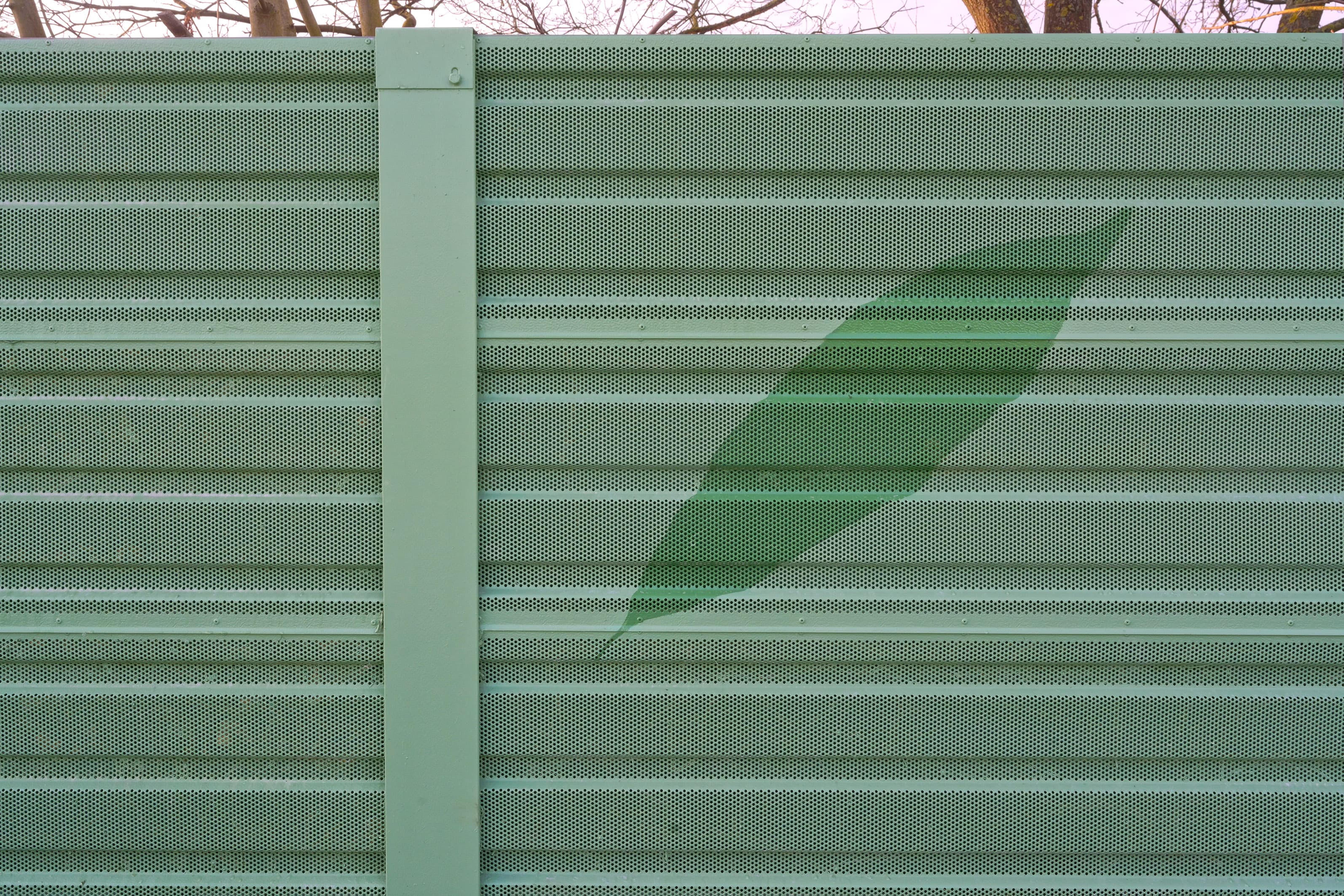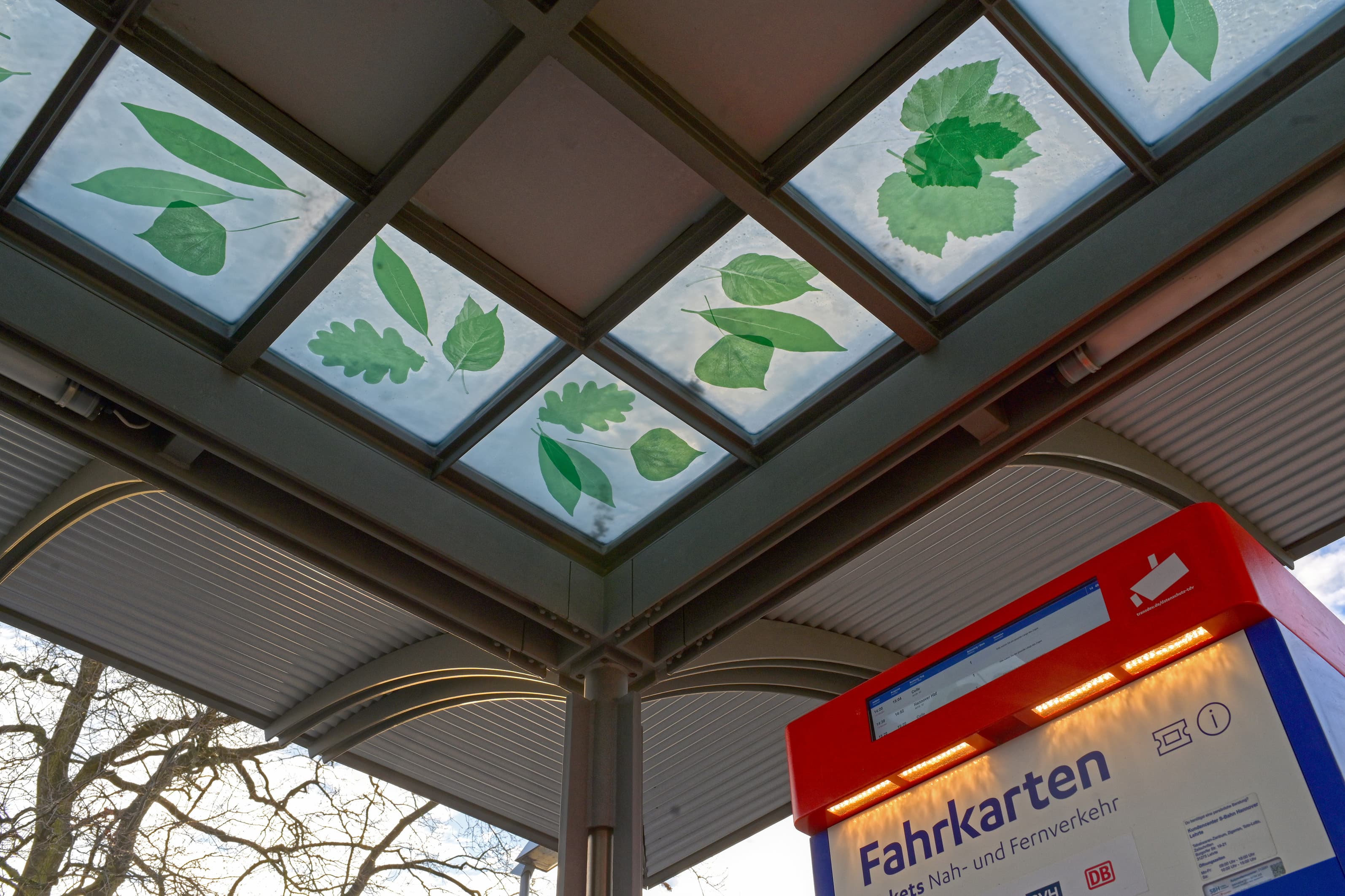 Link zu diesem Abschnitt kopierenViele Bestandteile des Bahnhof Otze wurden in eine übergreifenden Gestaltung mit einheitlicher Farbgebung und Blattmotiven übernommen. So auch die vorhandene Lärmschutzwand im Bahnsteigbereich.