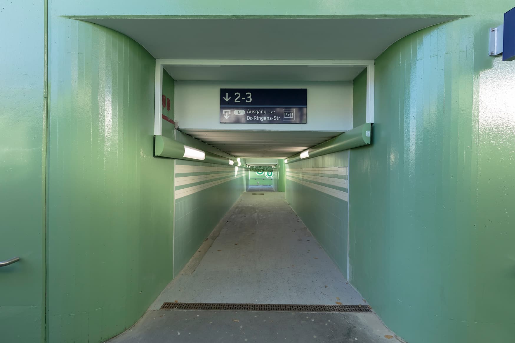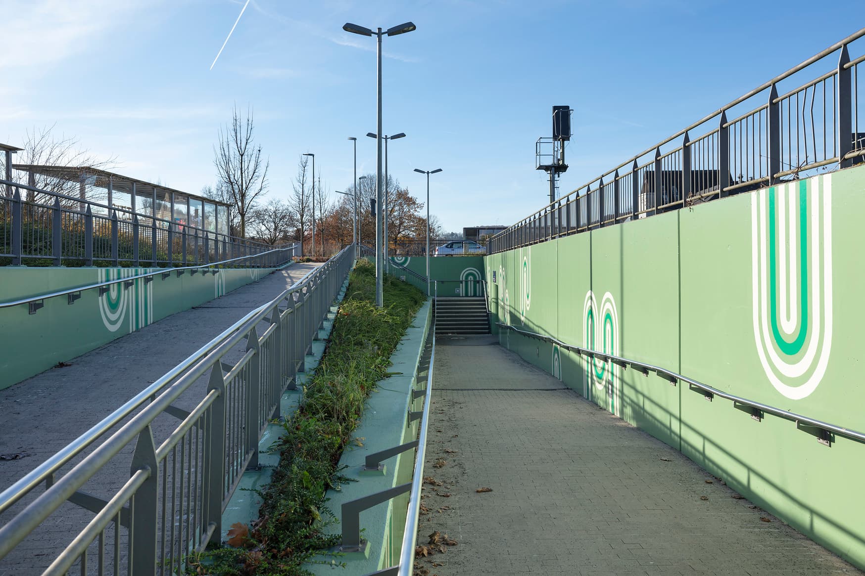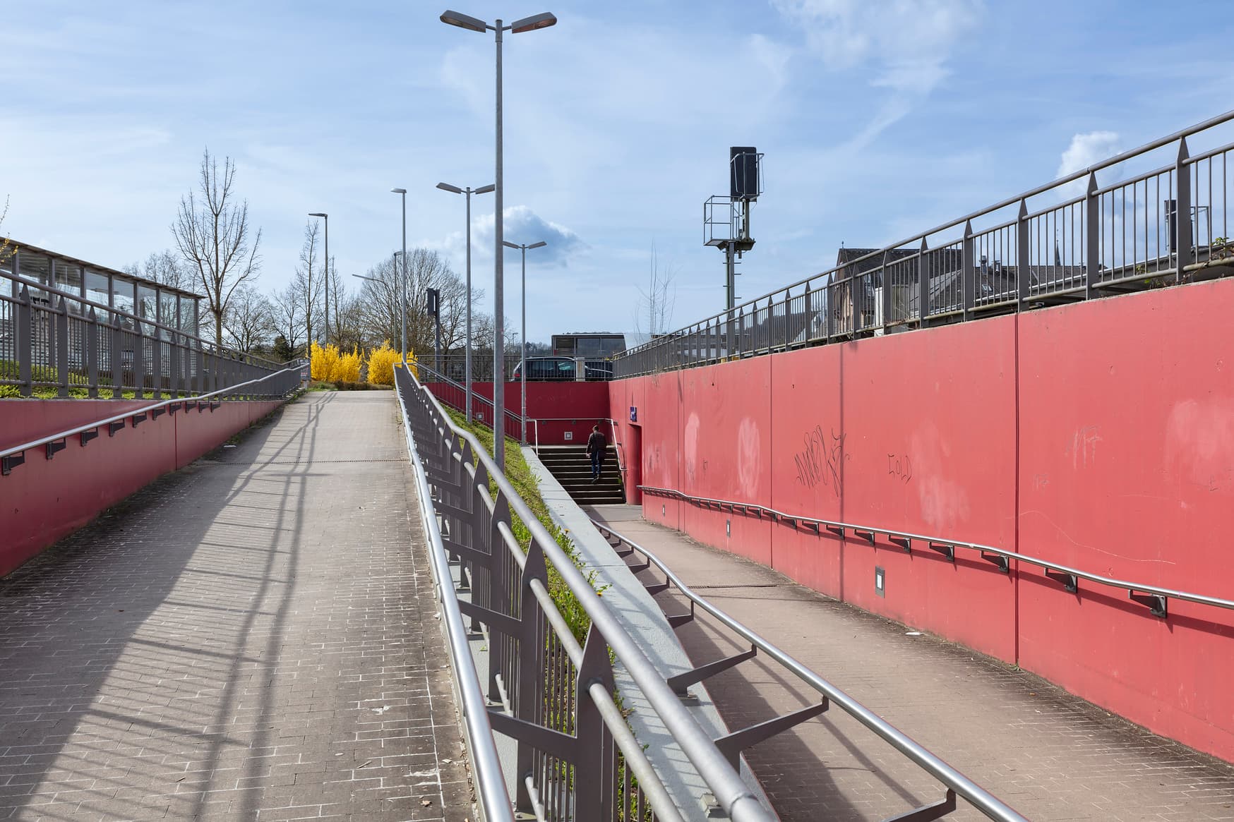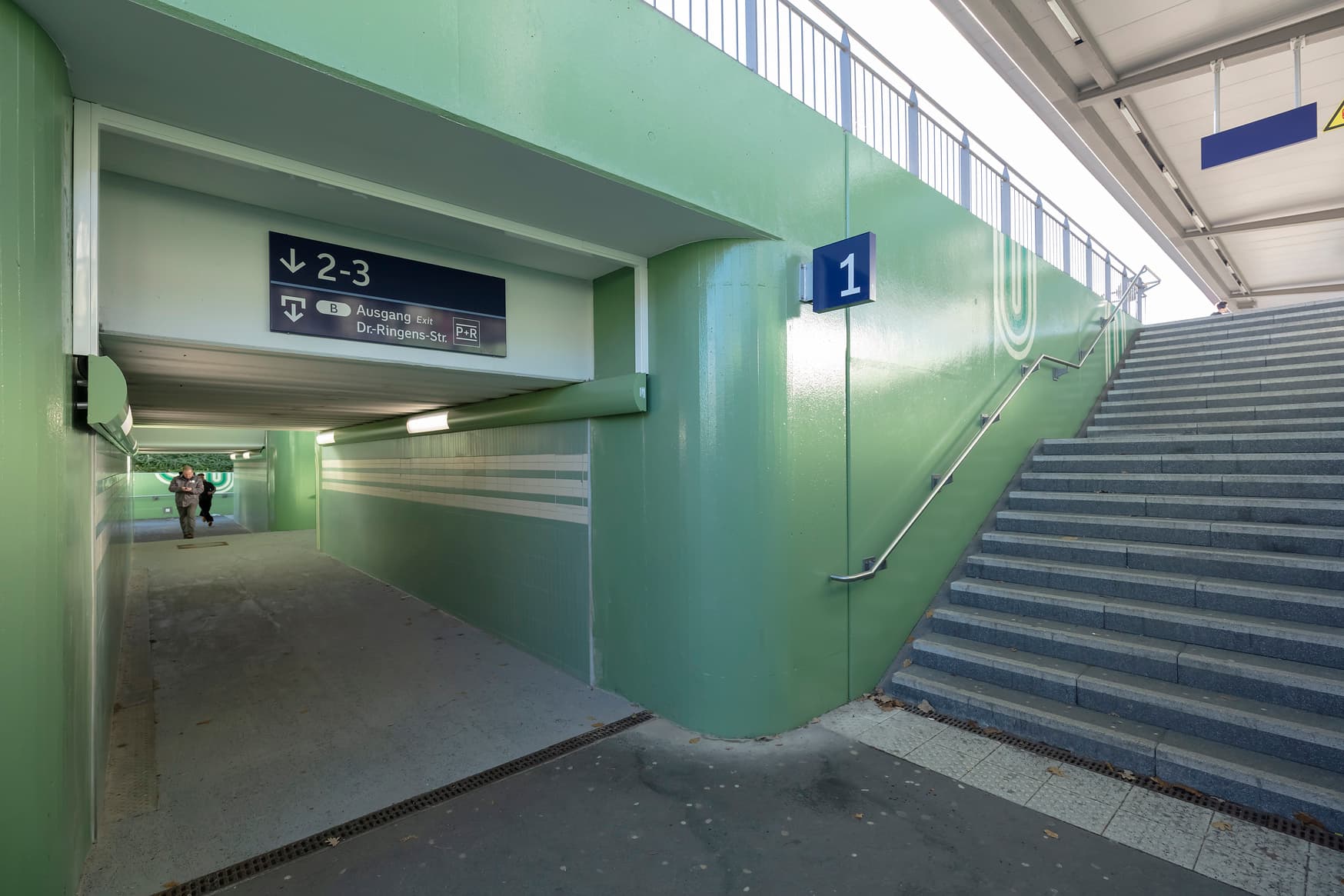 Link zu diesem Abschnitt kopierenDie neue Gestaltung der Unterführung, der Rampen und der Stützpfeiler bietet Reisenden eine attraktive und freundliche Umgebung. Sie greift mit dem Farbton „Bergisches Grün“ die Nähe zur Natur auf. Die verschlungene Grafik soll nicht nur die Reise der Kunden, die hier am Bahnhof beginnt, sondern auch die Reise durchs Leben symbolisieren. Denn: im ehemaligen Empfangsgebäude befindet sich unter anderem das örtliche Standesamt!