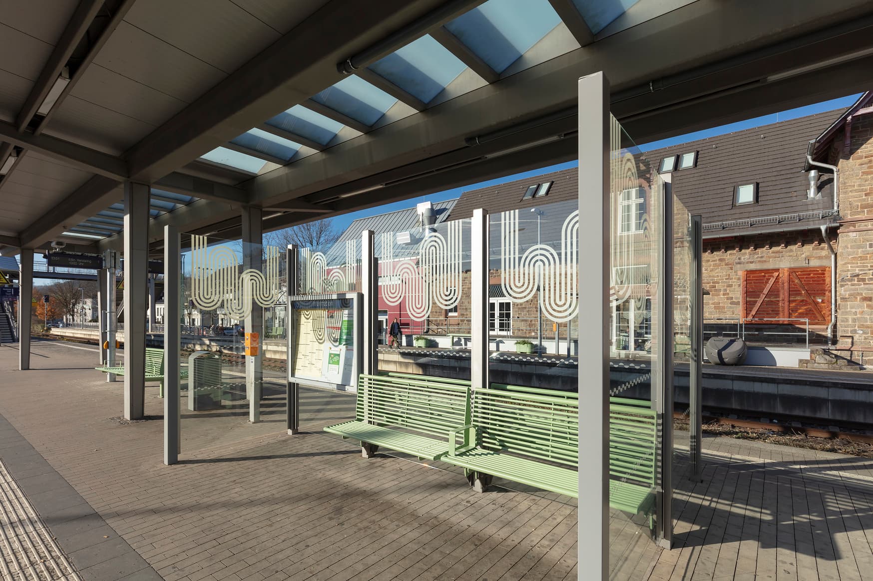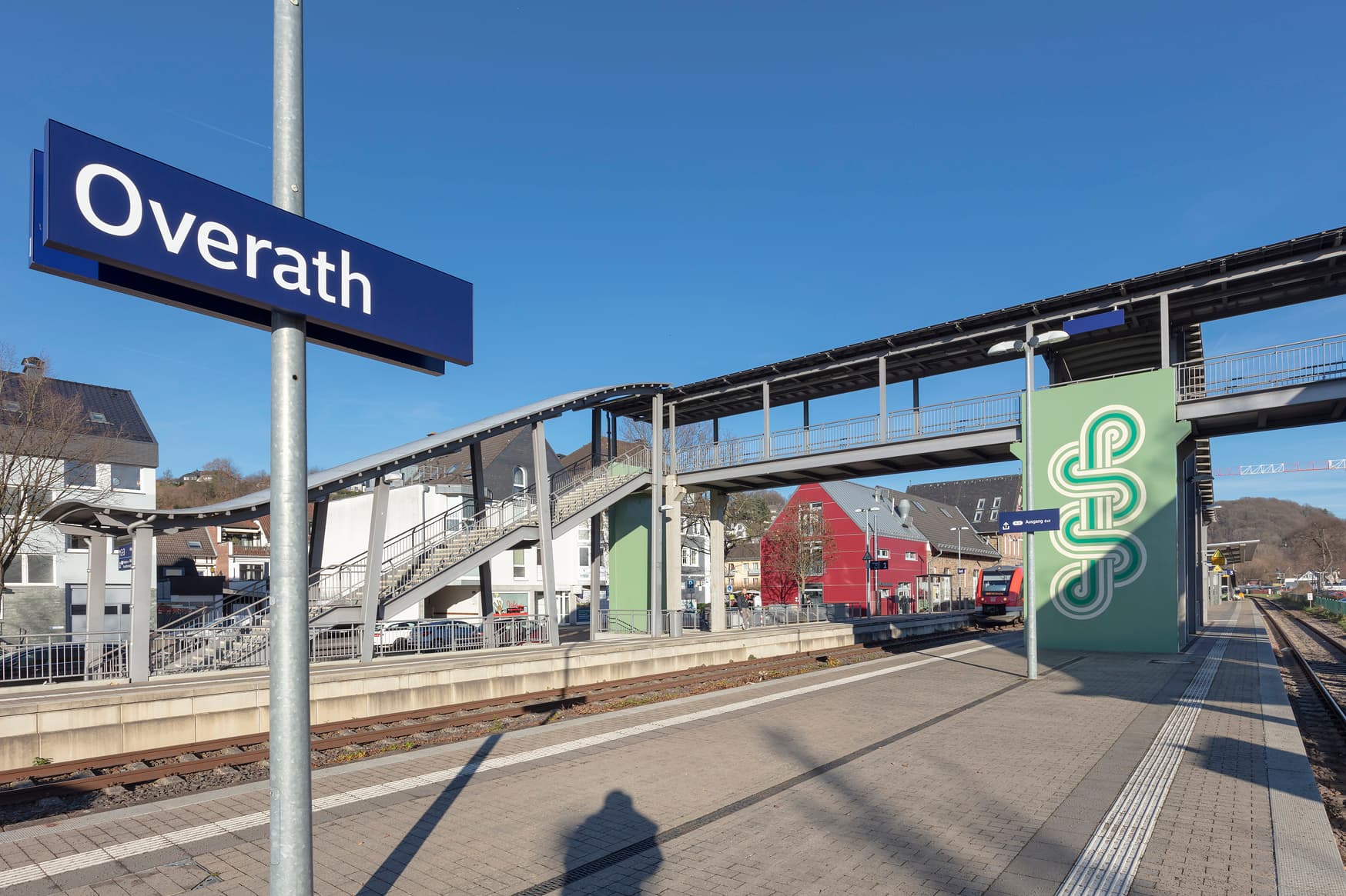 Die Stadt an Agger und Sülz – Am Bahnhof Overath werden Reisende durch die Neugestaltung freundlich begrüßt. Die neuen Sitzmöbel auf den Bahnsteigen ermöglichen einen angenehmen Aufenthalt. Zudem erscheint der Bahnhof in einem neuen Gewand unter dem Motto: Wandern und Wedding in Bergisch Grün.