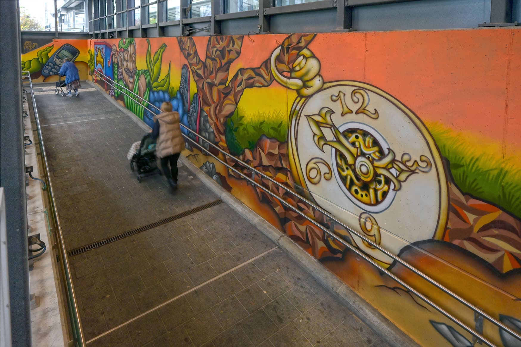 Link zu diesem Abschnitt kopierenDie durch die Stadt in Zusammenarbeit mit den lokalen Künstlern Justus Körtgen und Viktor Höricht gestaltete Personenunterführung bietet Reisenden und Besuchenden eine attraktive und freundliche Umgebung. Diese Gestaltung wurde im Rahmen des Konzepts Zukunftsbahnhof aufgefrischt und auf den Bahnsteigen sowie dem Bahnhofsumfeld ergänzt. Dadurch steigt die Aufenthaltsqualität am Bahnhof deutlich.